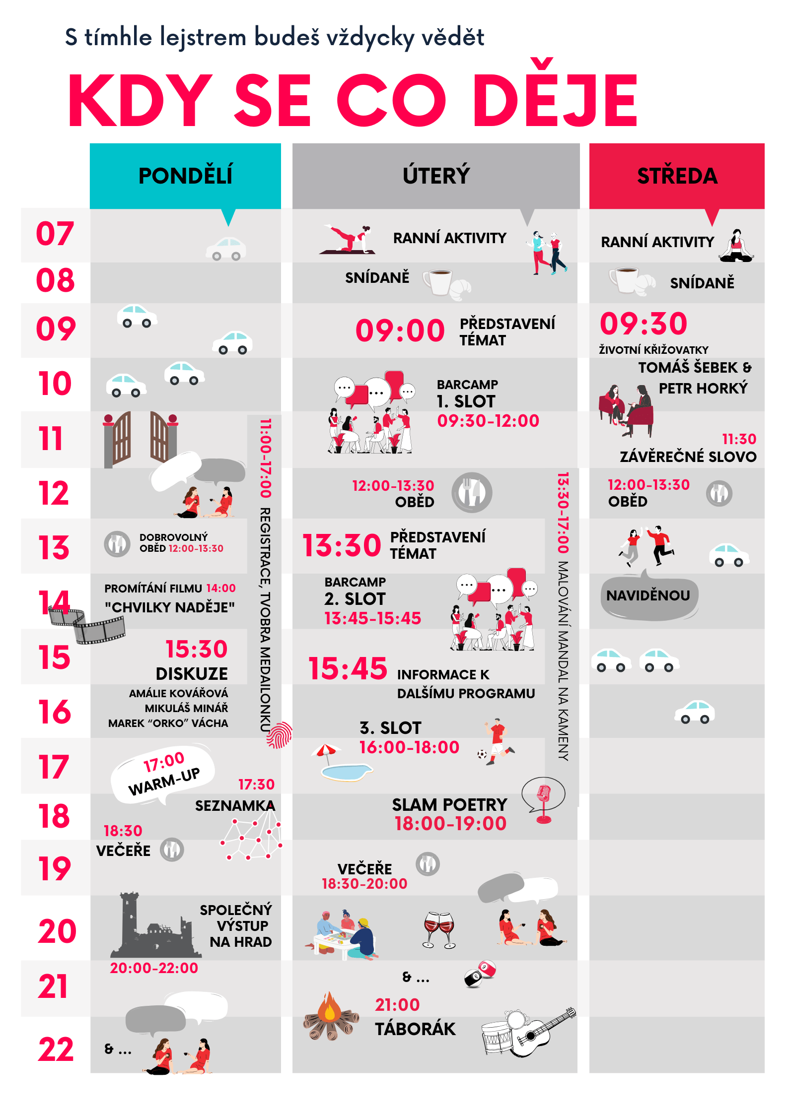 Úterý si představ jako švédský stůl plný chutí – a rozhodně přines i něco vlastního! Většina programu totiž vznikne až na místě. Čekají nás 3 dvouhodinové bloky a každý může přispět – něčím, co umí, co ho baví, nebo co chce sdílet. Můžeš si něco připravit dopředu, nebo se nechat inspirovat až v danou chvíli. Program tedy bude na nás všech (koukni na to jak barcamp funguje). Jediné riziko? Nestihneš být všude 😁