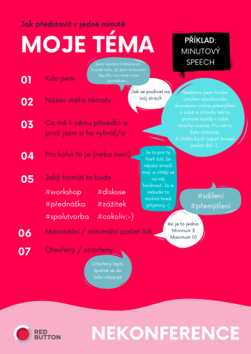 Na představení témat bude vždy 15 minutový blok před každým slotem. Na obrázku níže je nápověda 👇, jak můžeš v jedné minutě téma představit.